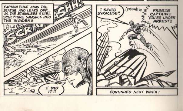 Inspired at the age of eleven by the artwork of JOE SINNOTT in TREASURE CHEST and JOURNEY INTO MYSTERY, Joe Orsak launched a comic strip in the newspapers of Syracuse, NY in 1982 called THE ADVENTURES OF CAPTAIN ‘CUSE. The strip ran weekly for eight years.